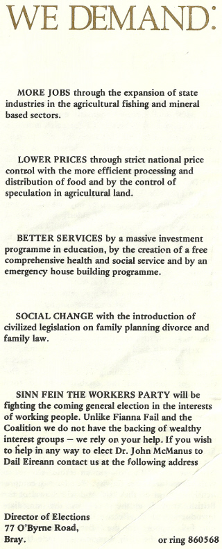 Leaflet from John McManus -Sinn Fein the Workers Party -1977 General Election Wicklow » jmcmanus77c