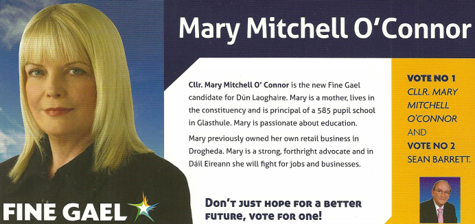 From the 2011 General Election a flyer from Mary Mitchell O’Connor of Fine Gael who was running in Dun Laoghaire. Standing in her first General Election, the former Progressive Democrat councillor was elected.
