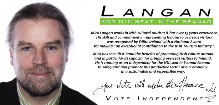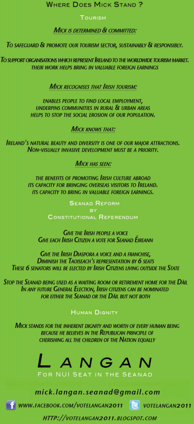 From the 2011 Seanad Elections a leaflet from Mick Langan who is running for a seat on the NUI panel. Langan did not post any flyers and is campaigning in the main through Social media.