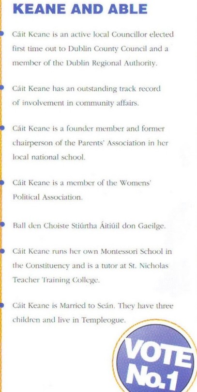 Leaflet from Cait Keane -Progressive Democrats -1994 Dublin South Central By Election » keane94b1