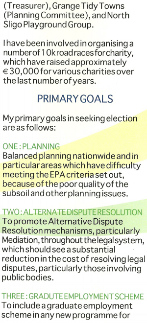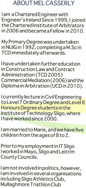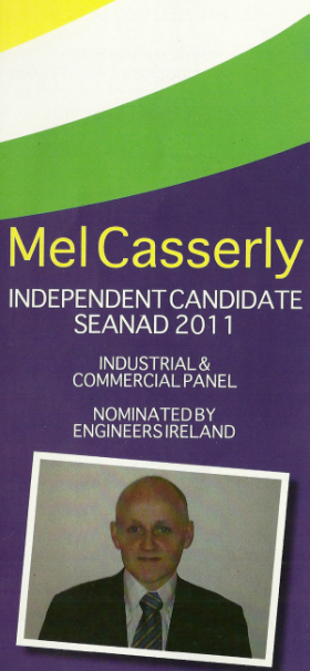 From the 2011 Seanad Elections a leaflet from Independent candidate Mel Casserly who is running for a seat on the Industrial & Commercial Panel. Casserly is a lecturer in Sligo IT.