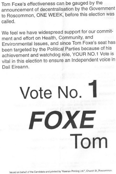 Leaflet from Tom Foxe -1992 General Election- Longford Roscommon » Foxe92a