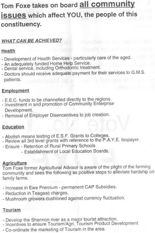 Leaflet from Tom Foxe -1992 General Election- Longford Roscommon » Foxe92b