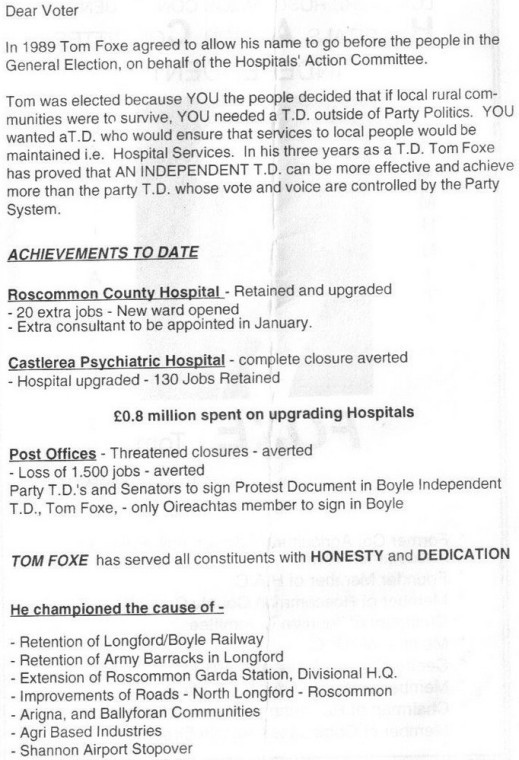 Leaflet from Tom Foxe -1992 General Election- Longford Roscommon » Foxe92b1