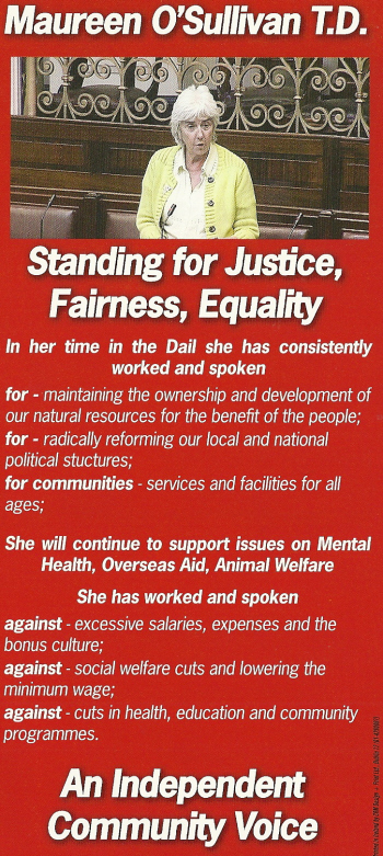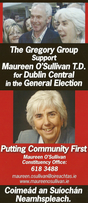 From the 2011 General Election a flyer from Independent TD Maureen O’Sullivan who was running in Dublin Central. O’Sullivan, the Gregory Group candidate, held on to the seat she won in the 2009 Dublin Central By-Election.