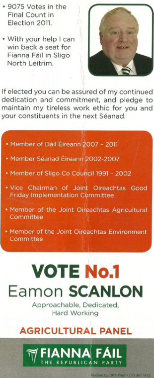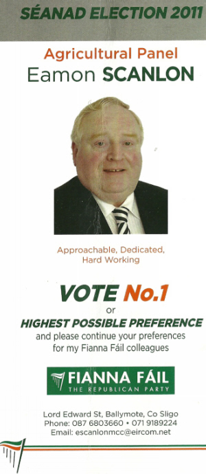 From the 2011 Seanad Elections a flyer from Eamon Scanlon of Fianna Fail running for a seat on the Agricultural Panel. Scanlon was previously elected to the Seanad on the Agricultural Panel in 2002 before winning a Dail seat in 2007 in Sligo North Leitrim. He lost his seat in the 2011 General Election.