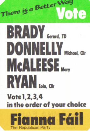 flyer for Mary McAlesse, Gerard Brady, Michael Donnelly, Eoin Ryan-Fianna Fail- Dublin South East 1987 GE » dse87b