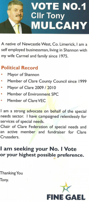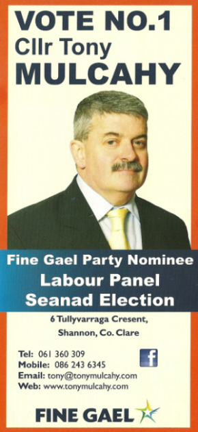 From the 2011 Senad Elections a flyer from Fine Gael candidate Tony Mulcahy who is running for a seat on the Labour Panel. Shannon based Mulcahy , stood in the 2011 and 2007 General Elections in Clare without success.