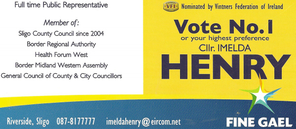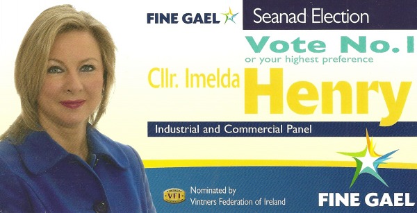 From the 2011 Seanad Election a flyer for Sligo based Fine Gael candidate Imelda Henry running for a seat on the Industrial & Commercial Panel. The Sligo based councillor was nominated by The Vintners Federation of Ireland. She ran in the 2007 General Election and Seanad Election failing to win a seat on both occasions.