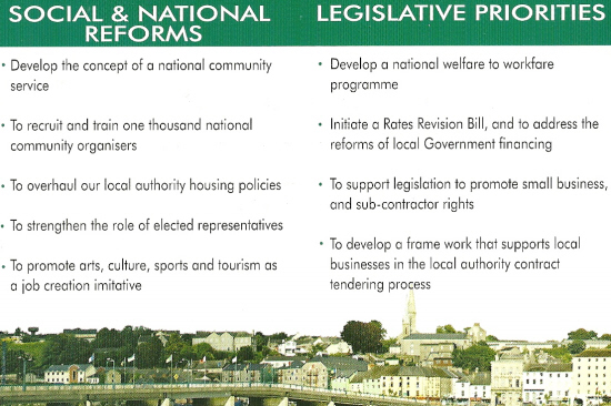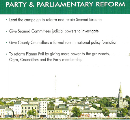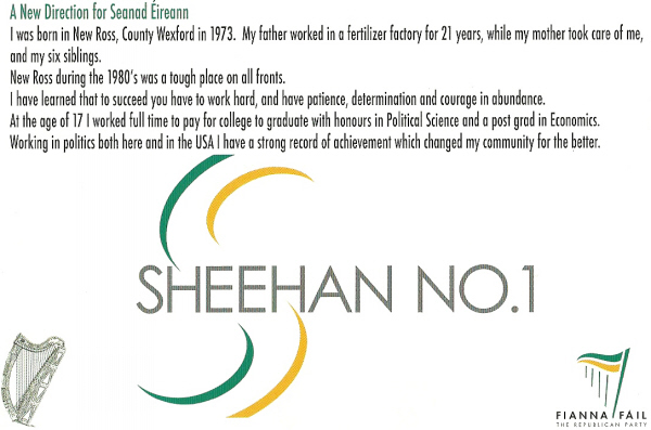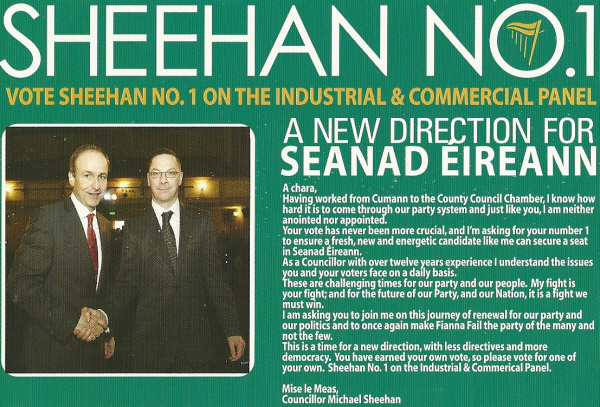 From the 2011 Seanad Elections a leaflet from Michael Sheehan of Fianna Fail who is running for a seat on the Industrial & Commercial Panel. Sheehan is a New Ross based Councillor. (New Ross has supplied at least 3 Fianna Fail Seanad candidates in Sheehan, Jim Walsh and Sean Connick).