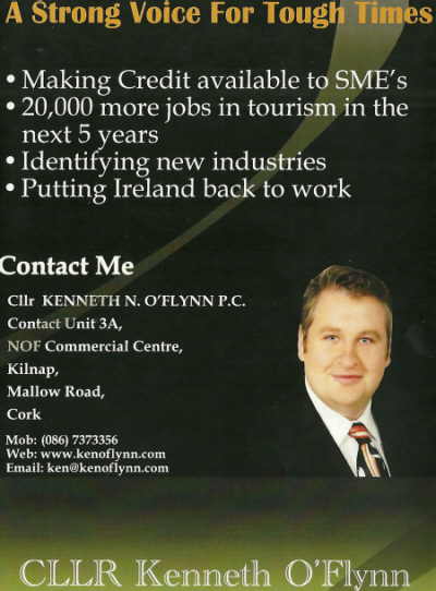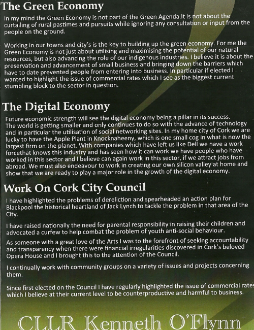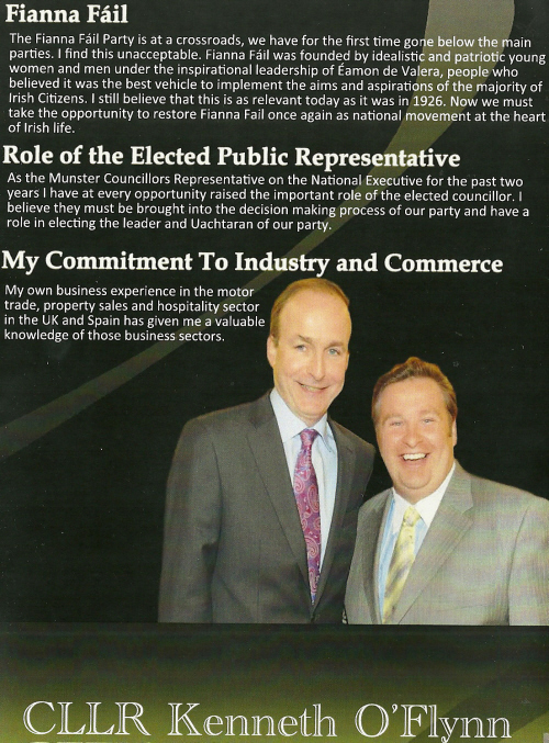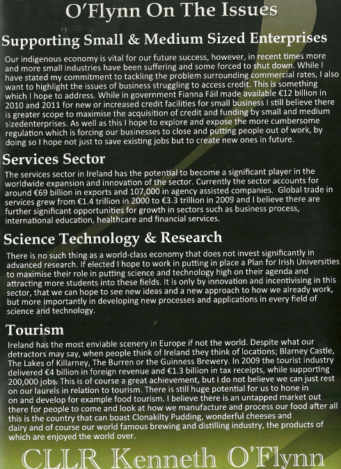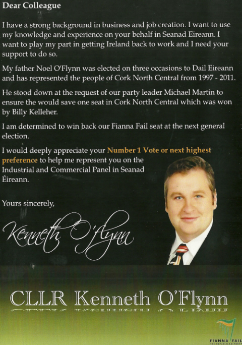 From the 2011 Seanad Elections a leaflet from one of Michael Martins chosen 10, Kenneth O’Flynn. Kenneth O’Flynn was running for Fianna Fail on the Industrial & Commercial Panel. In the leaflet, amongst other things, we have a great picture of the candidate with Michael Martin, a mention of his Father , Noel O’Flynns retirement at the behest of Michael Martin as well as Kenneth O’Flynns experience in business.