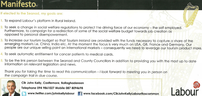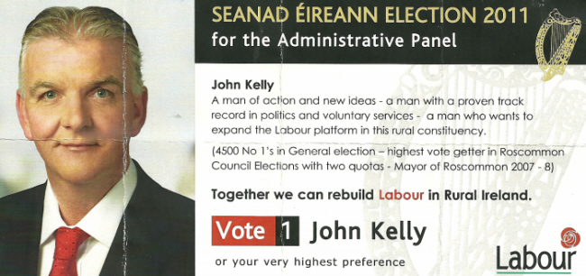 From the 2011 Seanad Election a leaflet from Labour Party candidate John Kelly who was running for a seat in the Administrative Panel. Roscommon based Kelly, a long time Independent Councillor joined Labour in 2010 and stood in the 2011 General Election for the party in Roscommon South Leitrim.