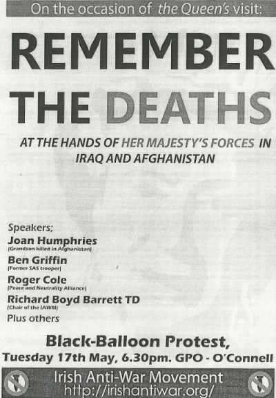 “On the Occasion of the Queen’s visit: Remember The Deaths…” -Irish Anti War Movement Leaflet » queeniawm1