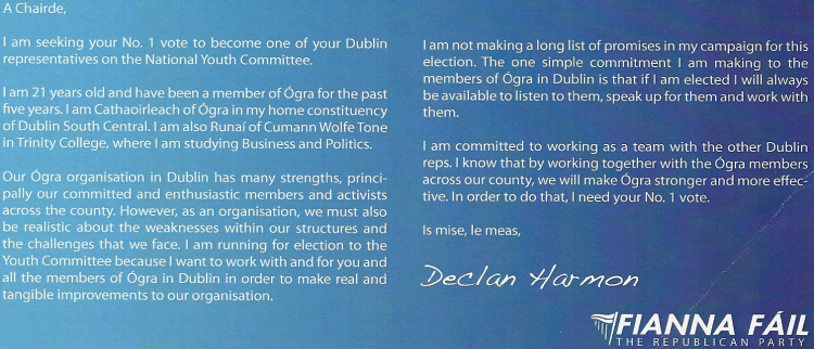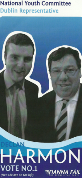 A Leaflet from candidate Declan Harmon to become the Dublin Representative of the Ogra Fianna Fail National Youth Committee. I think its from 2008.