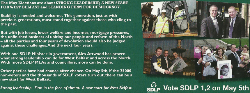 From the 2011 Assembly Elections a flyer for SDLP candidates Alex Attwood and Colin Keenan who were running in West Belfast. Attwood polled 3,765 votes and won a seat. Keenan polled 802 votes and missed out.