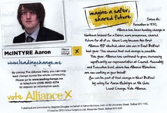Leaflet from Aaron McIntyre -Alliance Party -2011 West Belfast By Election » di1zv