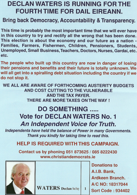 A leaflet from “Independent Pro-Life Christian Democrat” Declan Waters who was running in the 2011 General Election Waterford. In the leaflet amongst other things he mentions is that he “is running for the fourth time for Dail Eireann”. In 1997 he ran for ‘The National Party‘ , in 2002 he ran for the Christian Solidarity Party , in 2007 he ran as an Independent.