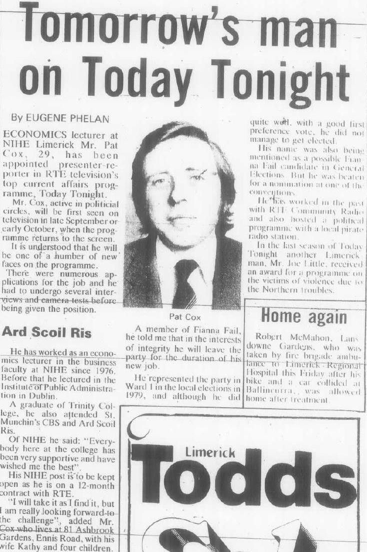 From 1982 a report on Pat Cox moving to Dublin “Tommorrow’s Man on Today Tonight” » lcoxtodaytonight