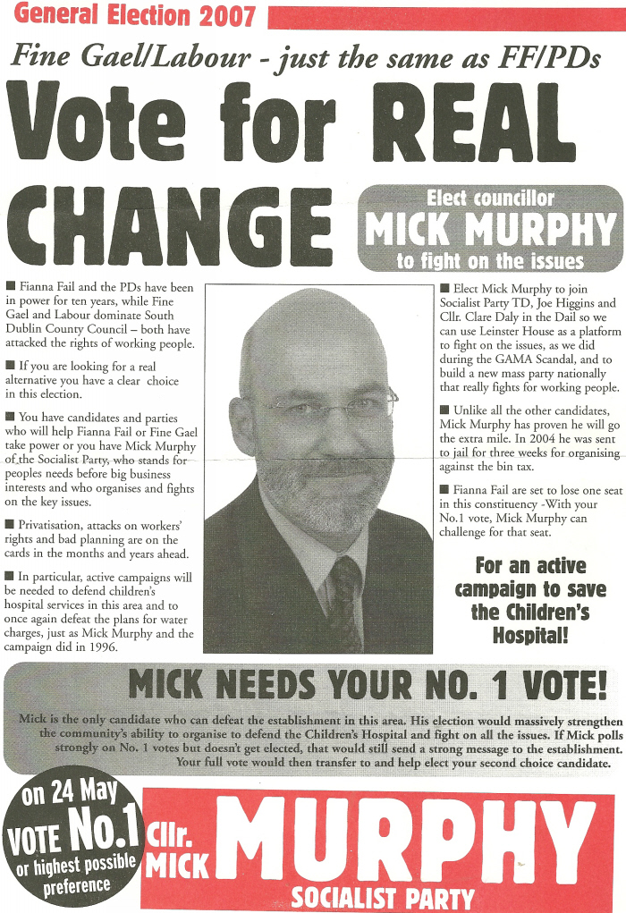 “Fine Gael/Labour – just the same as FF/PDs” writes Socialist Party Dublin South West candidate Mick Murphy in this leaflet from the 2007 General Election.