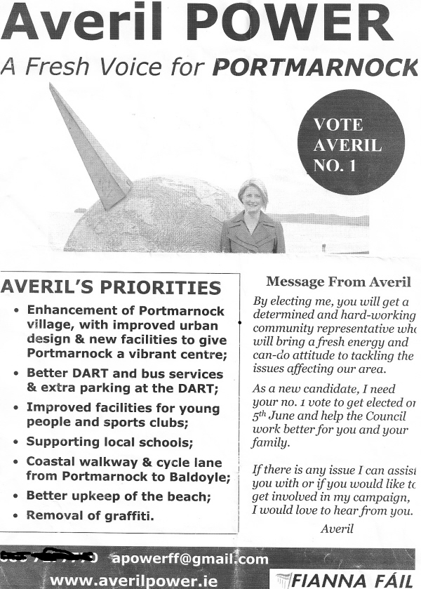 From the 2009 Local Elections in Howth Malahide, a leaflet from Fianna Fail candidate Averil Power with the headline “A Fresh Voice for Portmarnock”.Power who polled 1,659 votes and failed to win a seat writes…