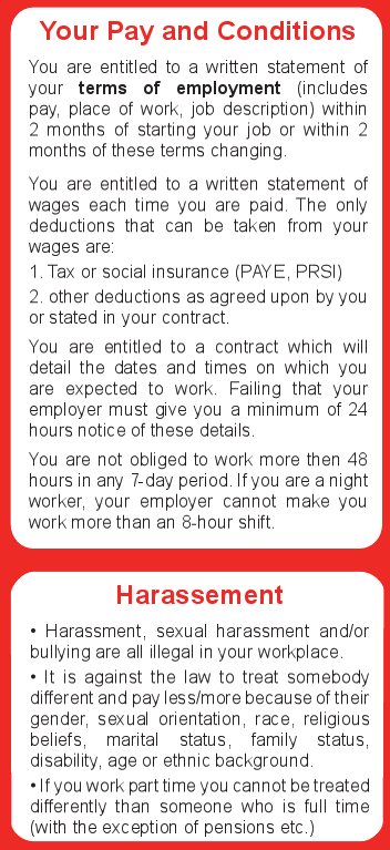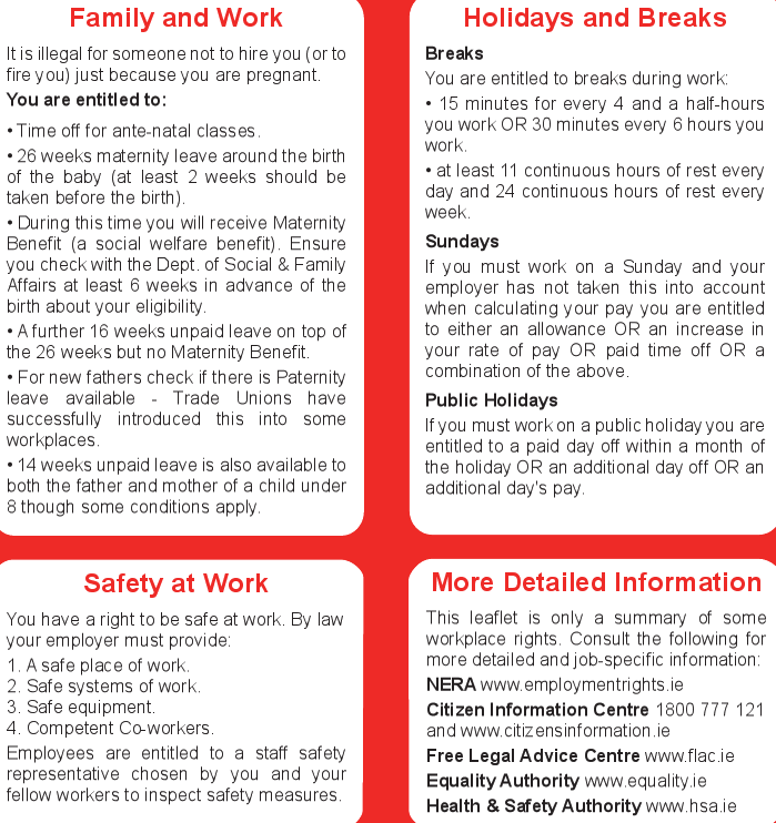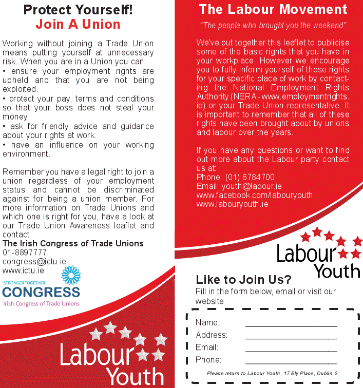 A leaflet from Labour Youth entitled “Know Your Rights”. The leaflet outlines your entitlements in areas such as safety at work, Family and work, holidays and Breaks, harassment and Pay and Conditions. It also encourages you to join a Union.