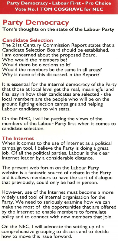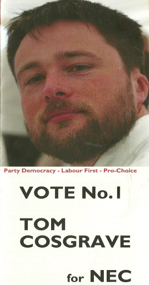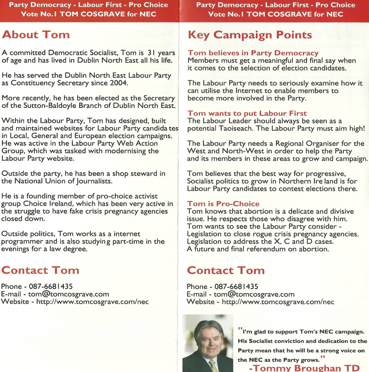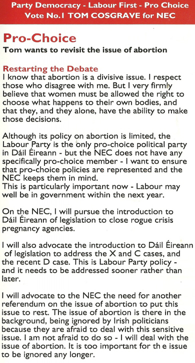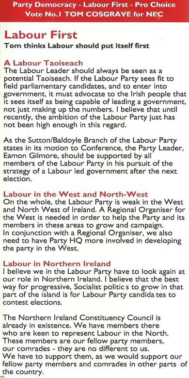 From (I think) 2010 a leaflet for Tom Cosgrave who was going forward for election to the Labour Party NEC. The Dublin North East based party activist had the slogan “Party Democracy -Labour First – Pro-Choice”.