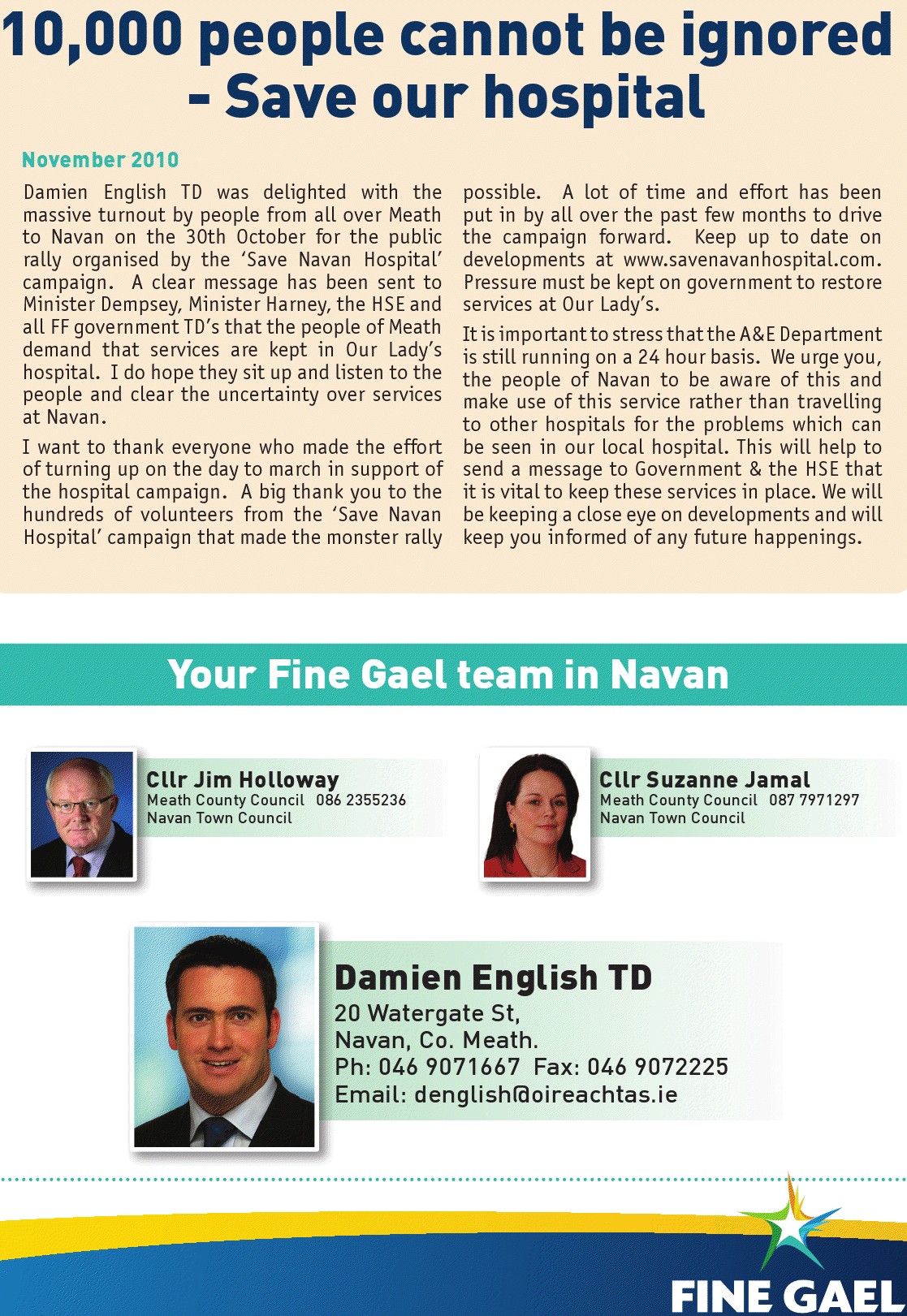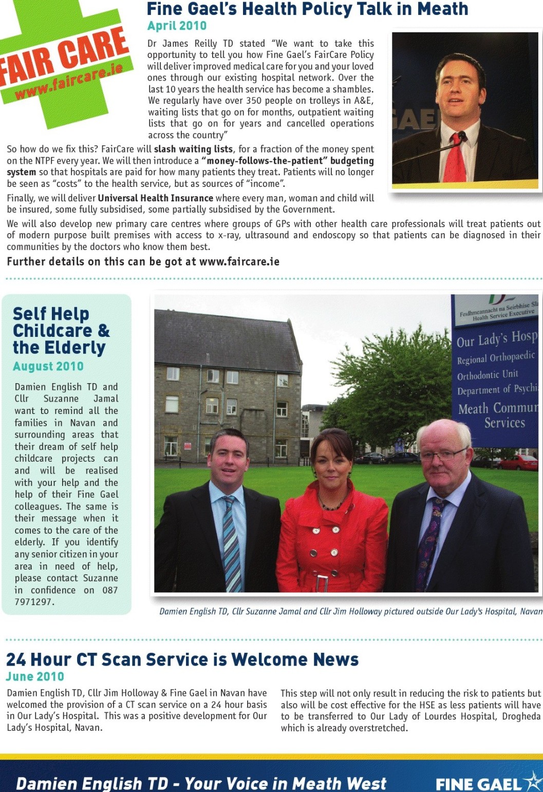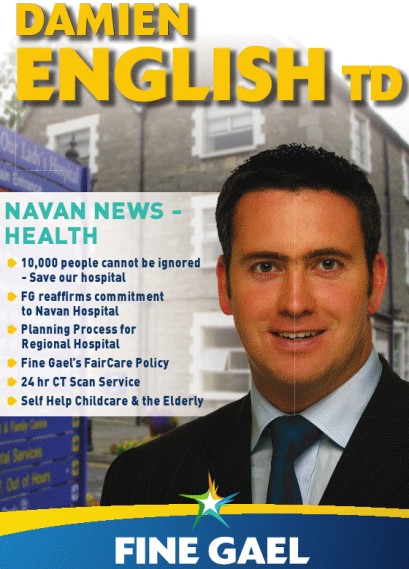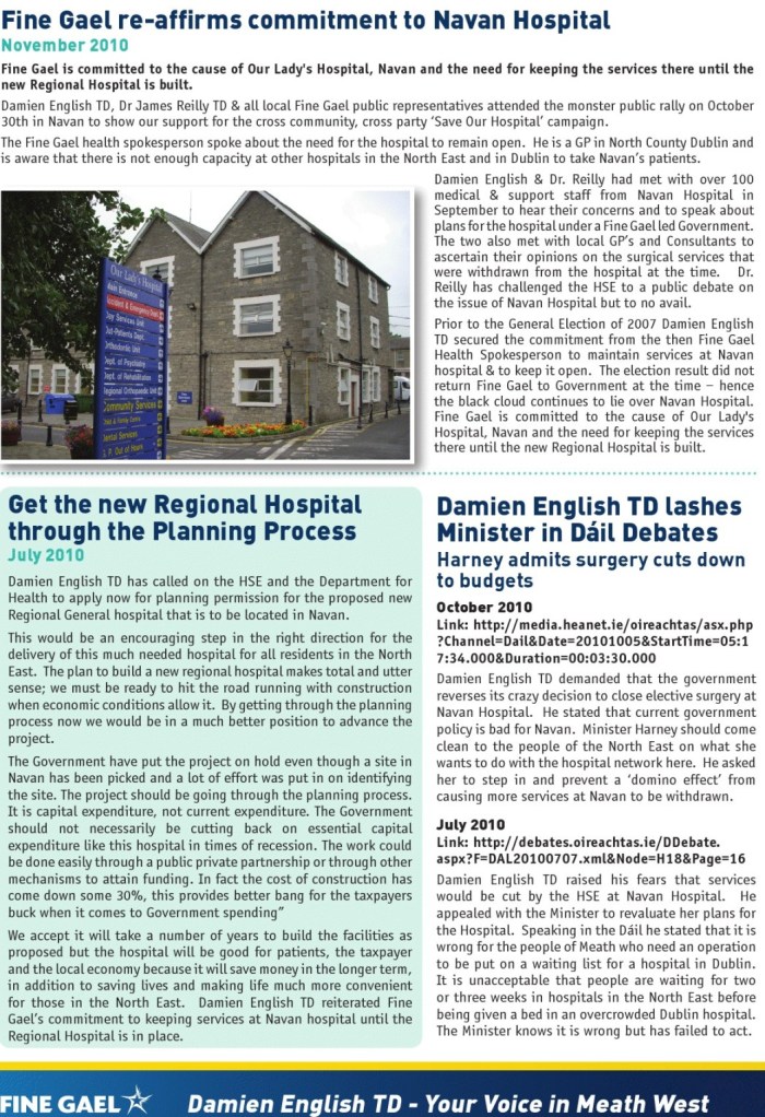 From November 2010 a leaflet from Fine Gael TD Damien English “Navan News – Health” focusing on Navan Hospital. Amongst the text is the following….