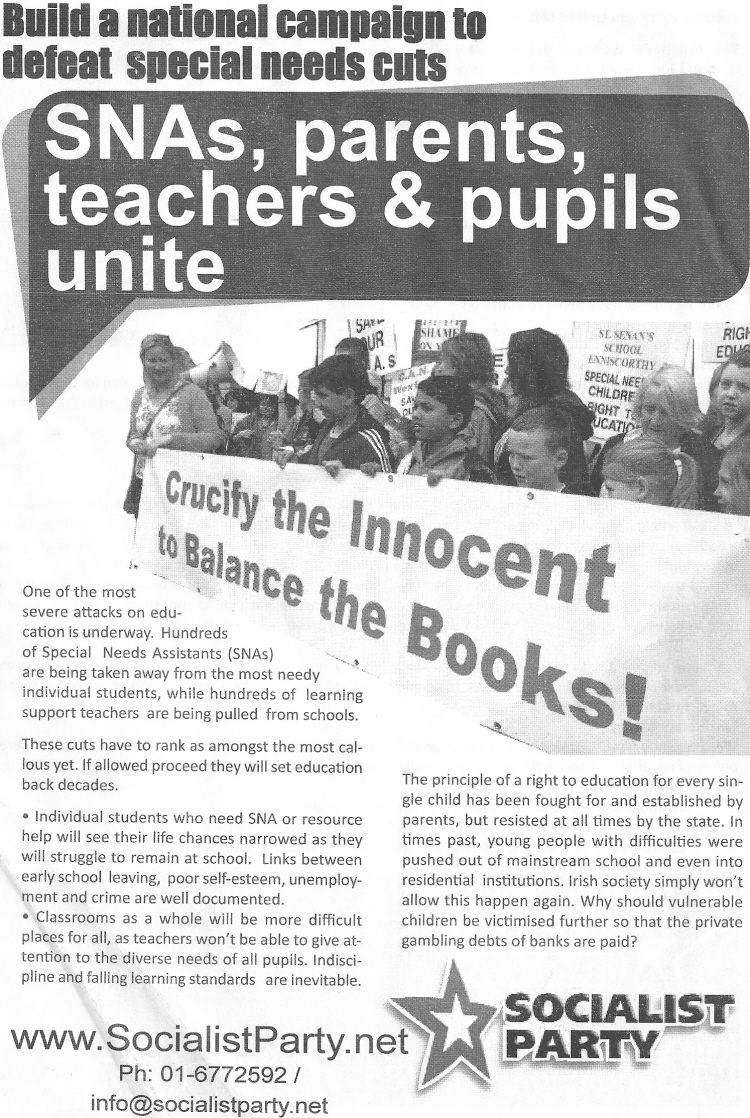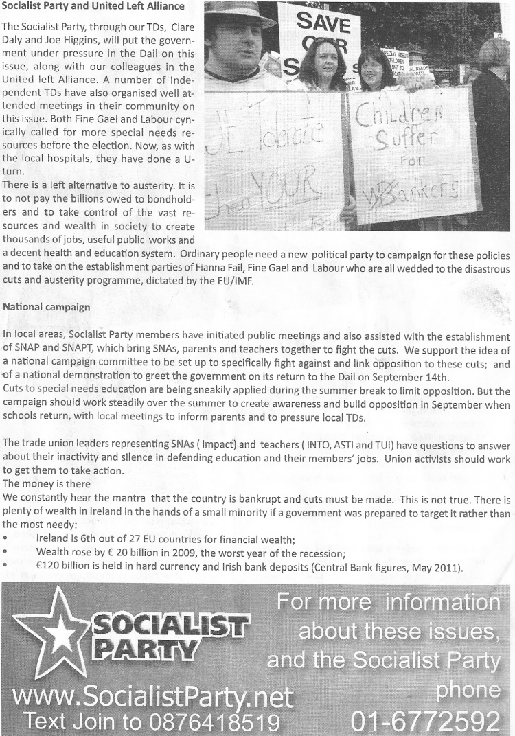 A leaflet from The Socialist Party distributed at the protest against cuts to Special needs “Build a national campaign to defeat Special Needs cuts” .