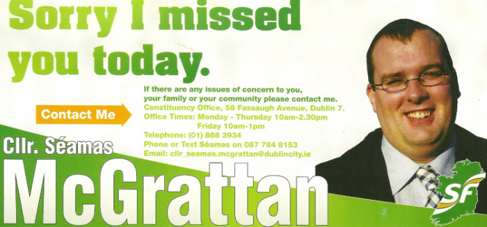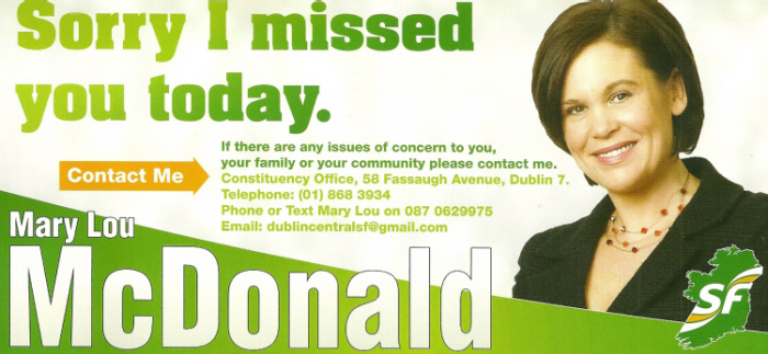 From the 2011 General Election Campaign, a “Sorry I missed you today” flyer from Mary Lou McDonald and Local Sinn Fein Councillor Séamas McGrattan. Much of McDonalds leaflets had endorsements from local Sinn Fein figures.