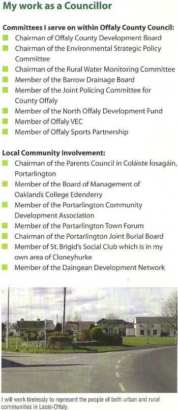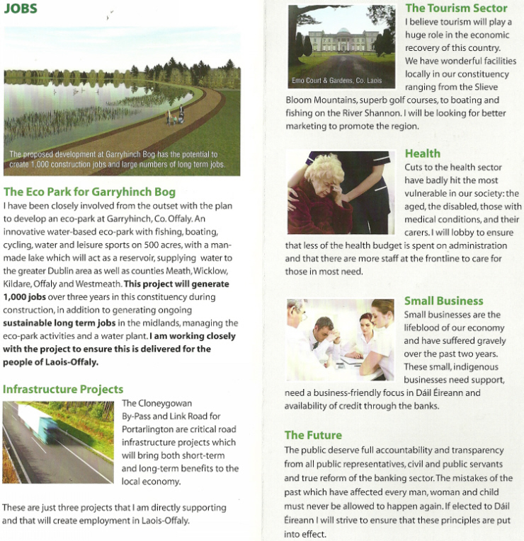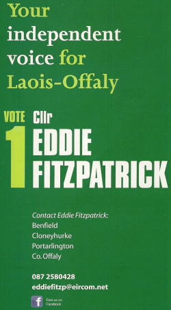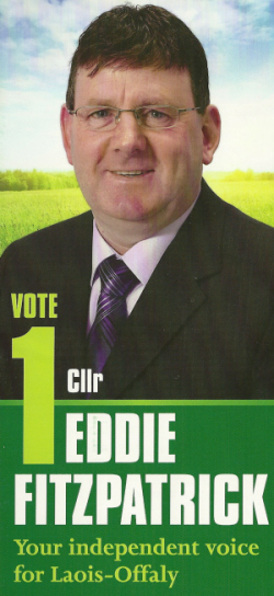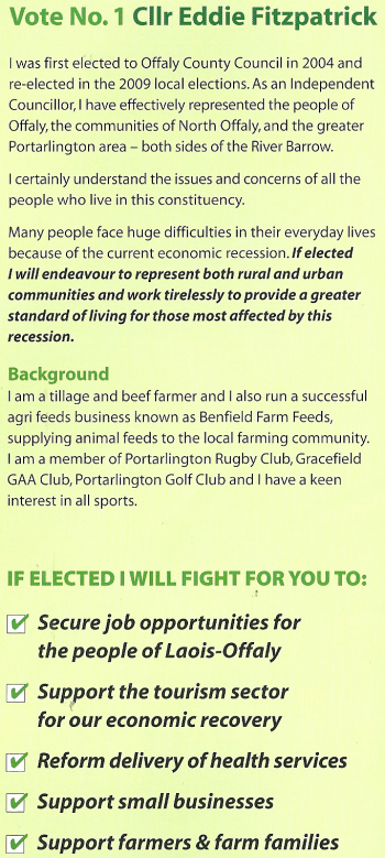 A 2011 General Election Leaflet from then Independent Eddie Fitzpatrick who joined Fianna Fail recently. The Portarlington based, former PD councillor left the PDs after the 2007 General Election and held his council seat in 2009.