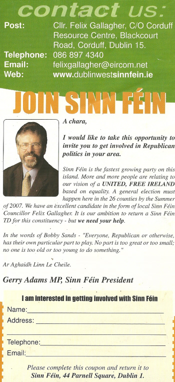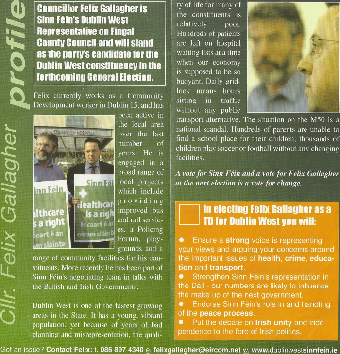 From the 2007 General Election Campaign a leaflet introducing Sinn Fein candidate Felix Gallagher to the electorate of Dublin West.