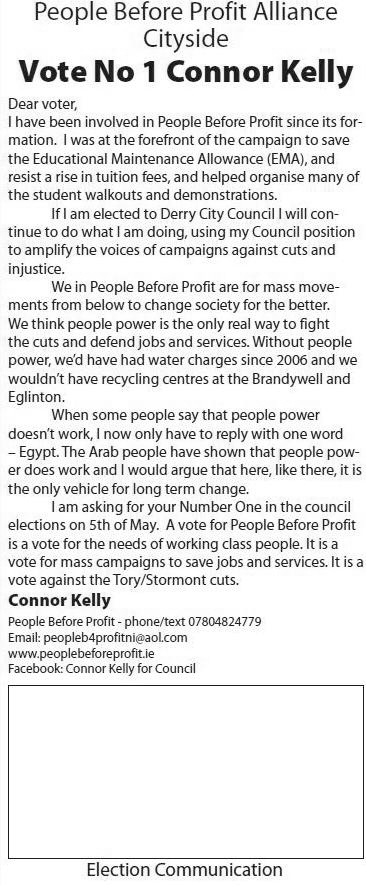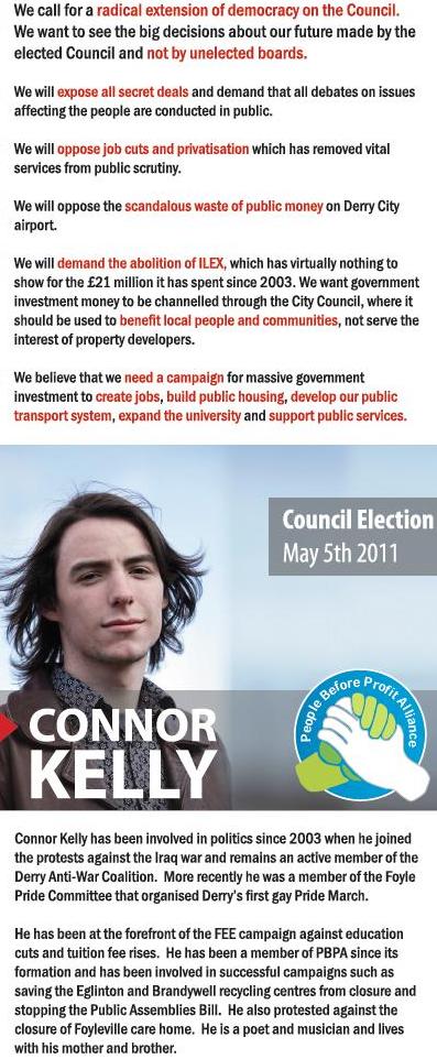 From the 2011 Local Elections for Derry City Council a leaflet from Connor Kelly who was running for People Before Profit in Cityside.