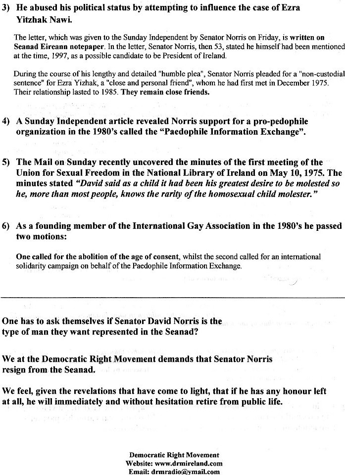 6 Responses to “Leaflet ..”calling for the withdrawal of Senator David Norris from political life” – Democratic Right Movement”
