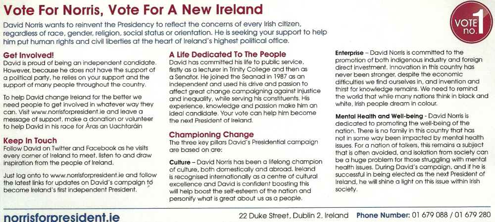 Leaflet from David Norris “Norris For President -Changing Ireland for the better”-2011 Presidential Election » norrispres2