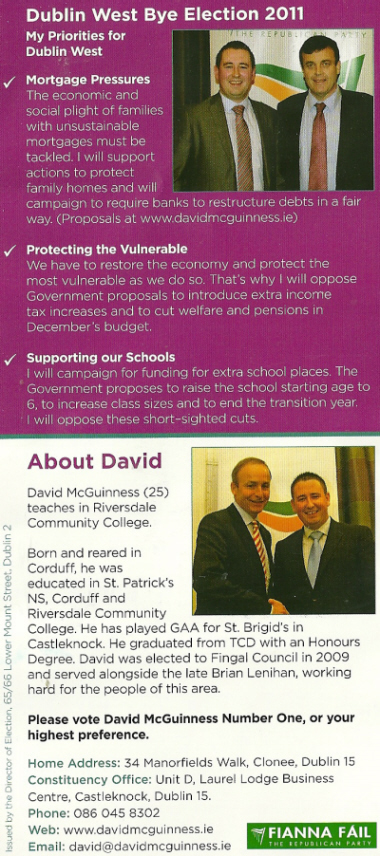 From the 2011 Dublin West By-Election a leaflet from Fianna Fail candidate David McGuinness. Amongst his priorities are