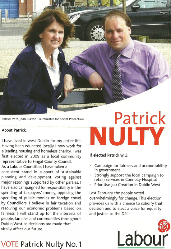 From the 2011 Dublin West by-election a leaflet from Labour Party candidate Patrick Nulty. Nulty who is Pictured with Joan Burton, polled 2,686 votes in the 2011 General Election.