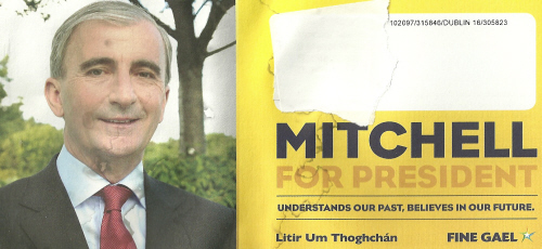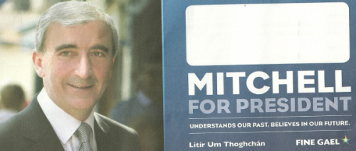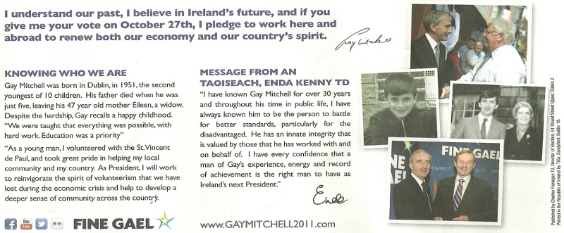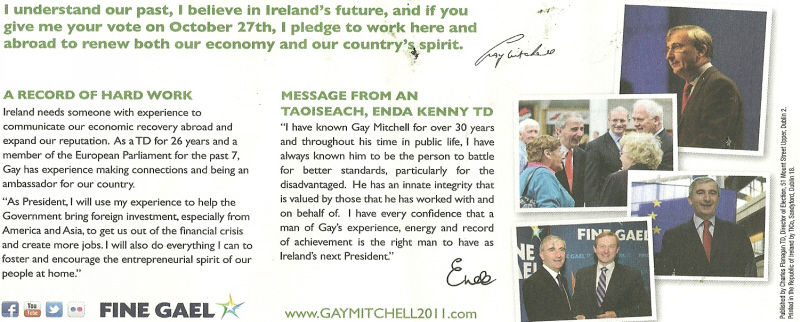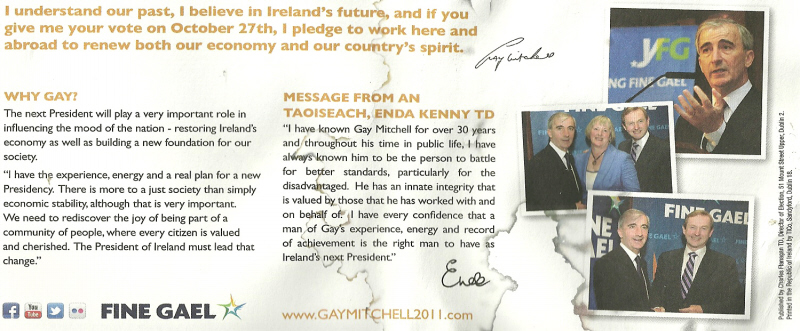 A Green Leaflet, a Yellow Leaflet and a Blue leaflet from Fine Gael 2011 Presidential Election candidate Gay Mitchell.