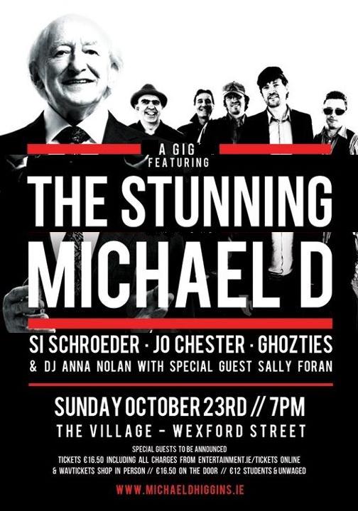 A Poster for the Michael D Higgins benefit gig on Sunday 23rd of October in the Village on Wexford Street featuring amongst others The Stunning.