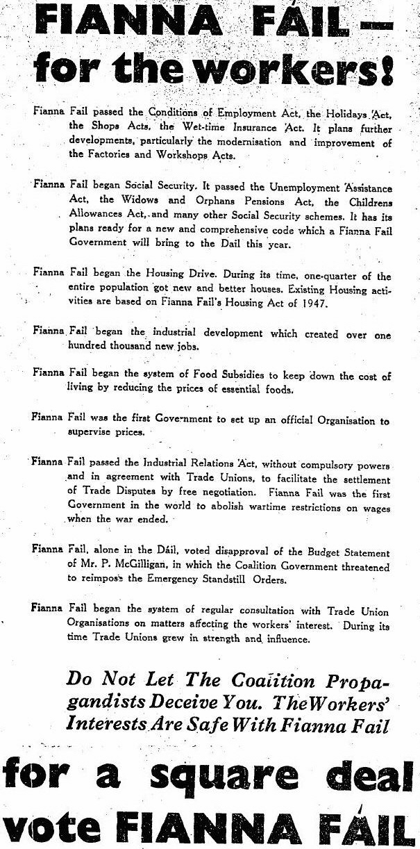 From the 1951 General Election campaign “Fianna Fail – for the Workers!” where Fianna Fail outline the benefits workers enjoyed under Fianna Fail.