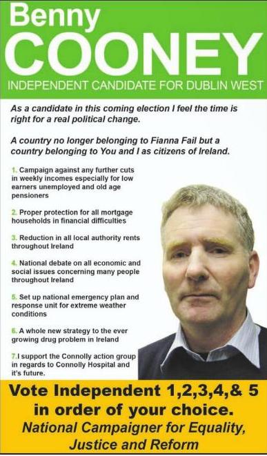 From the 2011 Dublin West By Election an Ad for Independent candidate Benny Cooney. A worker in FAS, Cooney has stood in numerous elections. His record at electionsireland.org
