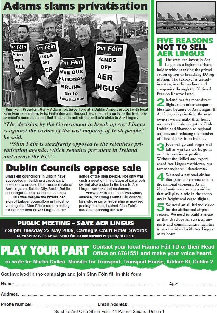 “No to Privatisation” of Aer Lingus Leaflet from Sinn Fein 2006 » sfaerlingus2