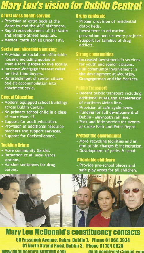 From the 2007 General Election a leaflet for Sinn Fein candidate Mary Lou McDonald who was running in Dublin Central. Elected an MEP for Dublin in 2004, she failed to win a seat here polling 3,182 votes. In 2011 she was elected in Dublin Central.