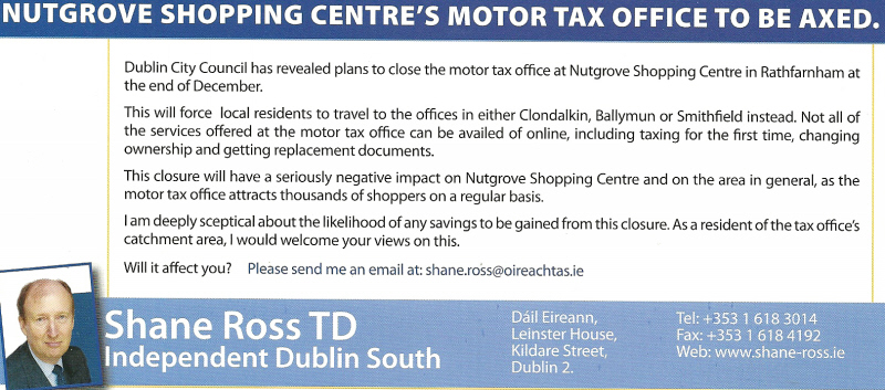 Picked this leaflet from Shane Ross up today outside the Motor Taxation Office in Nutgrove Shopping Centre. From talking to the gents manning the table with the petition its due to close by the end of December. Given the Shopping Centre is under enough pressure from having Dundrum in its vicinity, the closure can only put more pressure on the various outlets in the centre.
