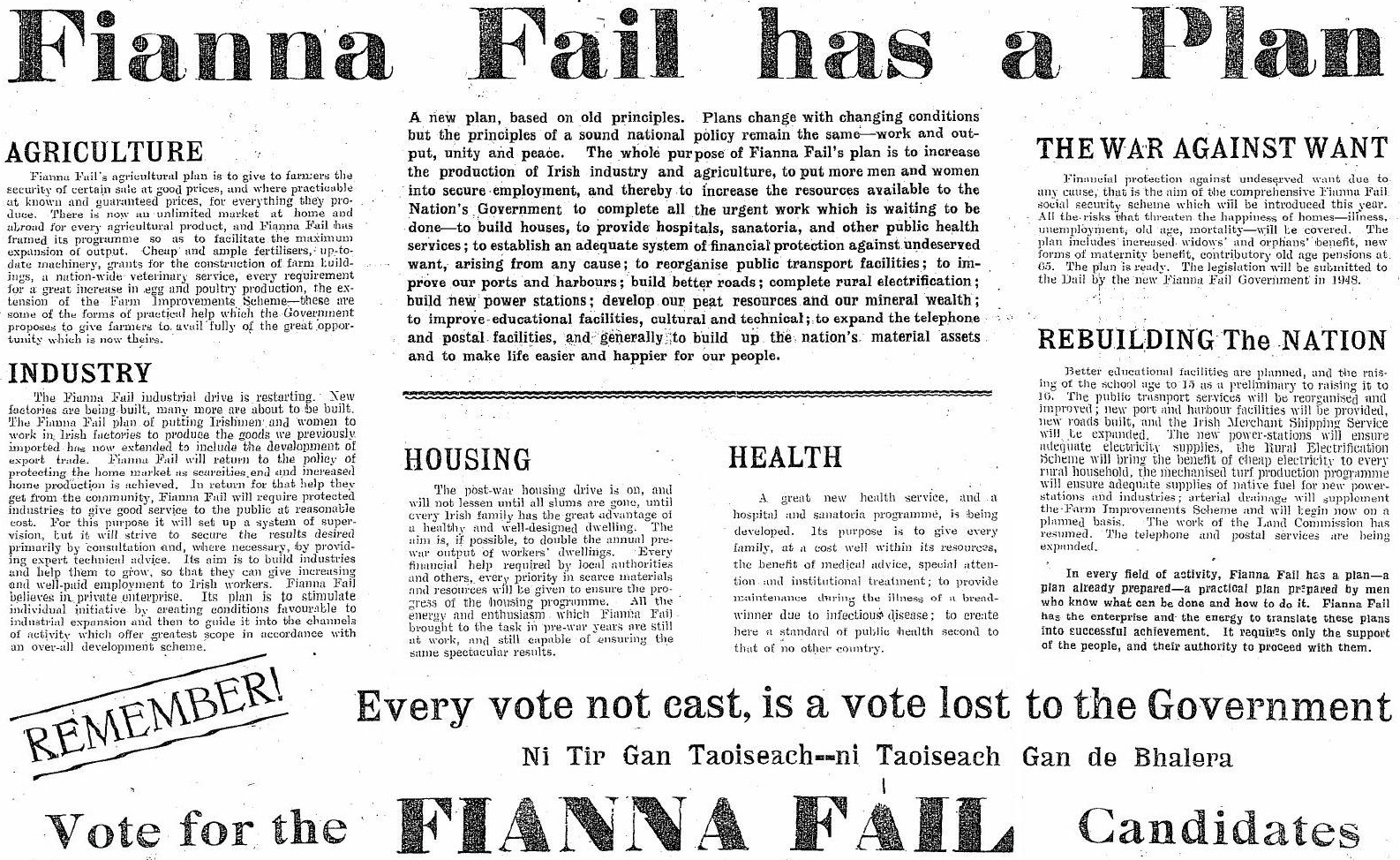 From the 1948 General Election campaign “Fianna Fail has a Plan” containing details of their plan. Agriculture, Industry, Housing and Health are amongst the areas covered.