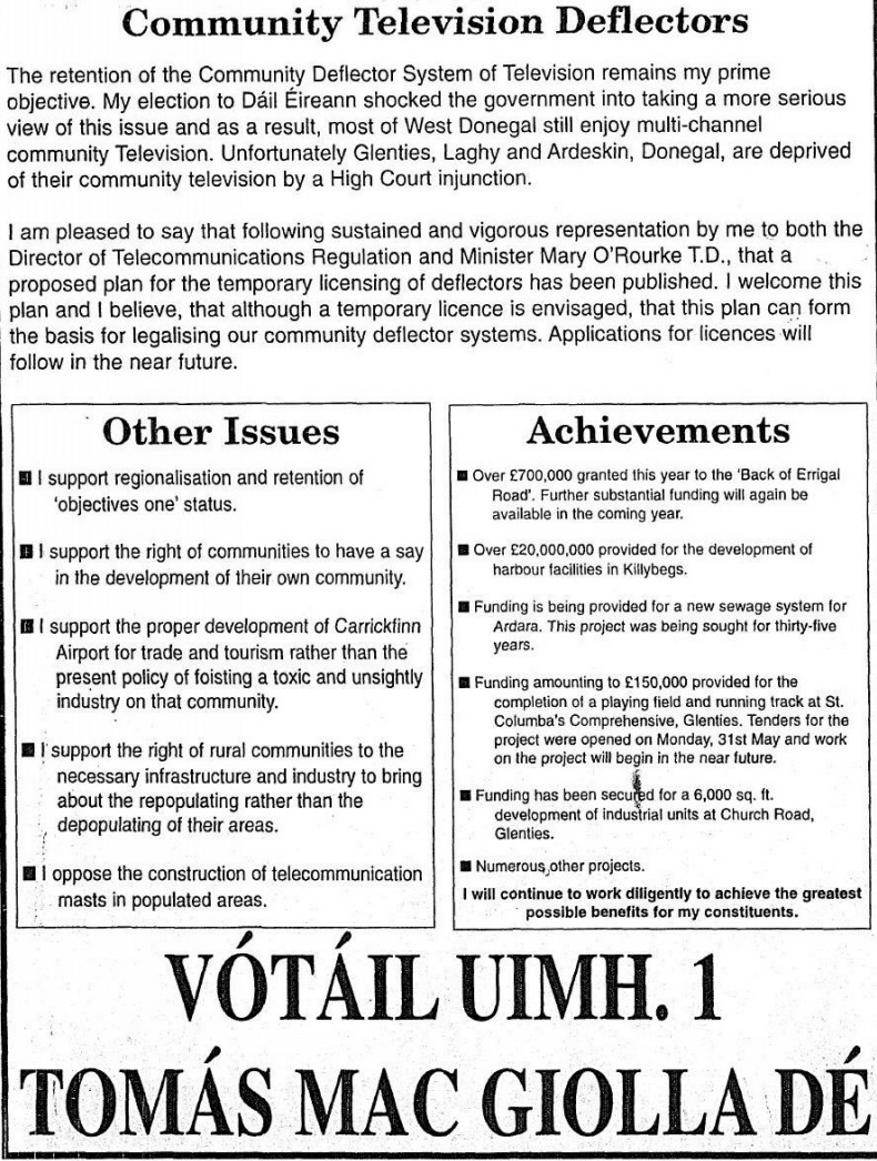 In the 1997 General Election Tom Gildea caused a shock when he was elected to the Dail for Donegal South West running on the issue of Television Deflectors. (Another ‘deflector’ candidate Dermot Kirwin polled almost 3000 votes in Waterford).