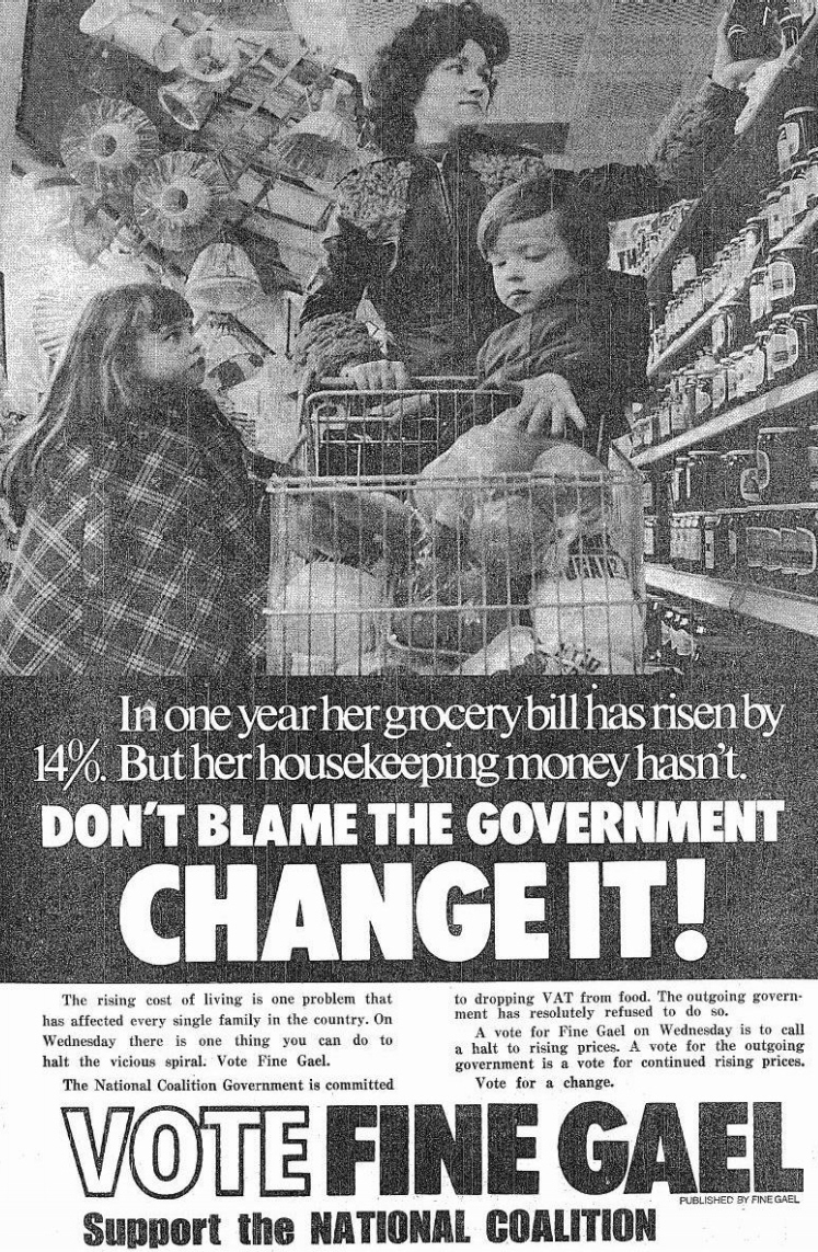 From the 1973 General Election an Ad from Fine Gael “In one year her grocery bill has risen 14%. But her housekeeping money hasn’t”.