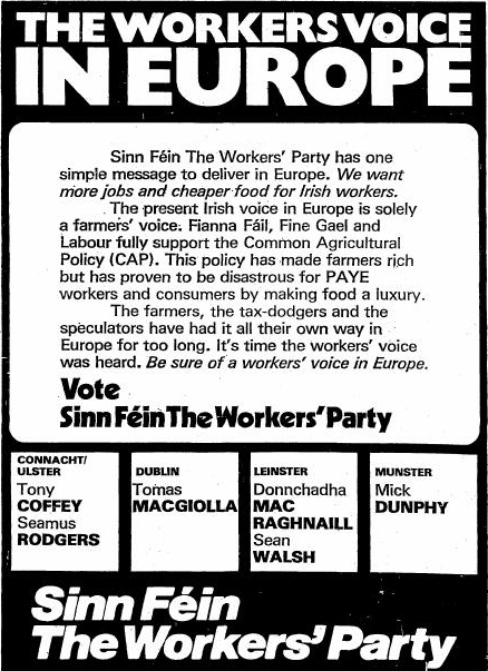 From the 1979 European Elections,”The Workers Voice in Europe” from Sinn Fein The Workers Party. There is a message of how the current representatives only had farmers interests at heart rather than workers interests. The party’s candidates Tony Coffey, Seamus Rodgers, Donnchadha Mac Raghnaill, Sean Walsh, Tomas MacGiolla and Mick Dunphy are listed at the bottom.