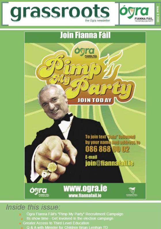 From 2006, Issue 9 of Ógra Fianna Fáil Magazine Grassroots with details of the “Pimp My Party” Recruitment Campaign » grassrootsissue9cover