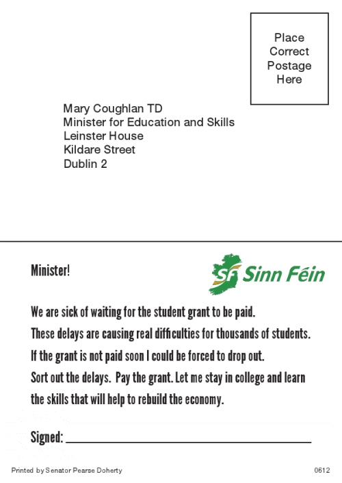 ‘Pot Noodle’ postcard from Sinn Féin protesting at delays in the payment of student grants » potnoodle2