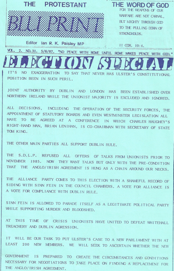 “The Protestant Blu Print” editor Ian R. K. Paisley MP- 1987 Election Special » pblueprint87a